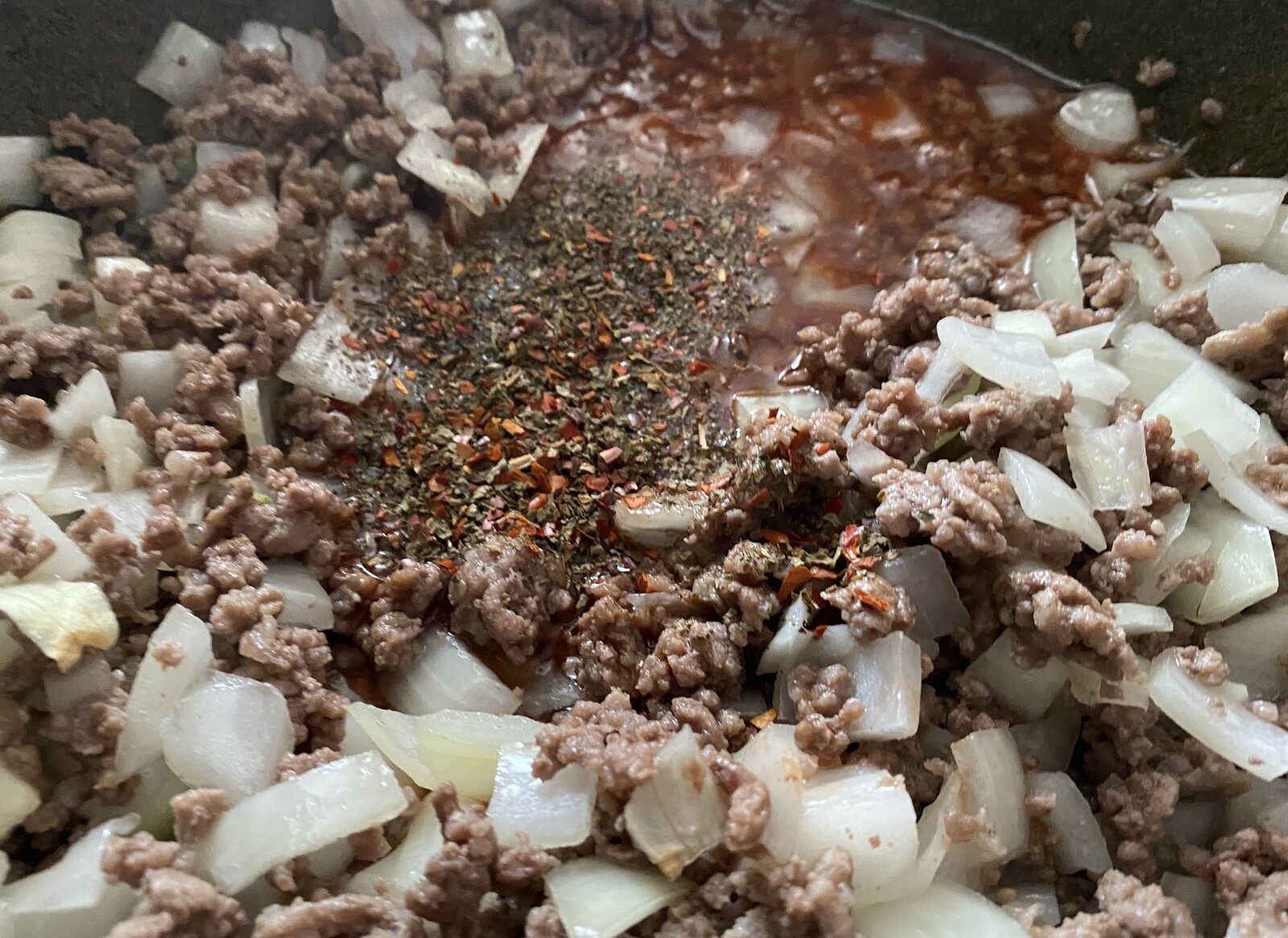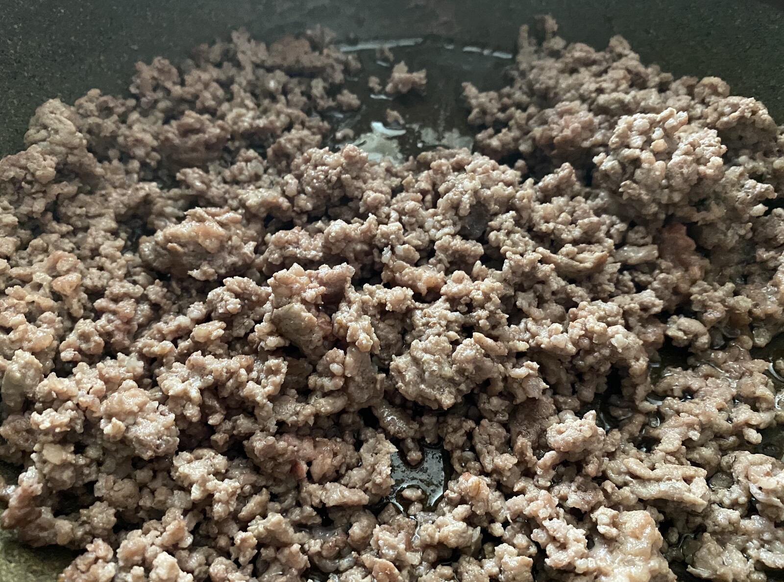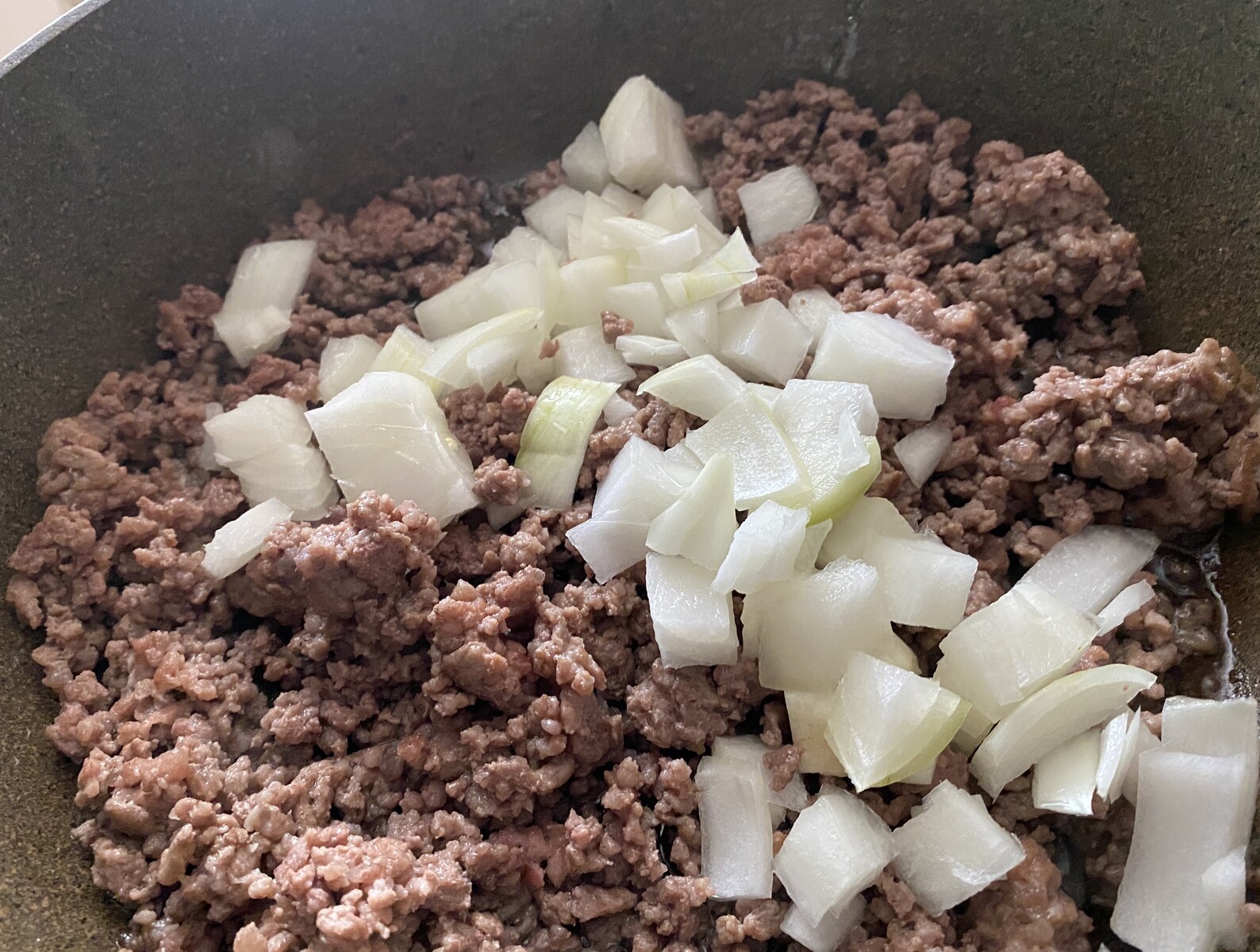 ②フライパンにオイルを入れ合い挽き肉をパラパラになるまで炒め