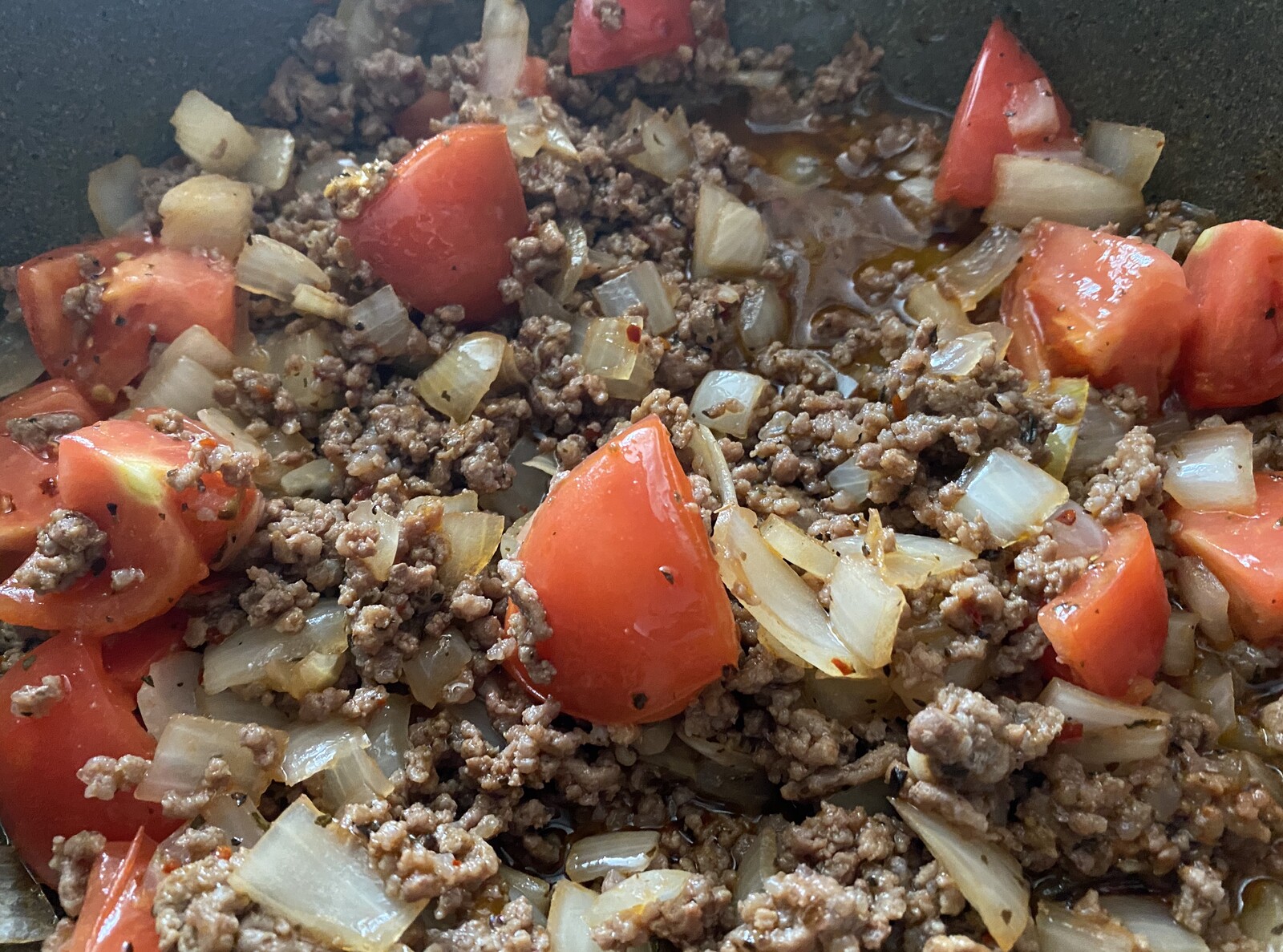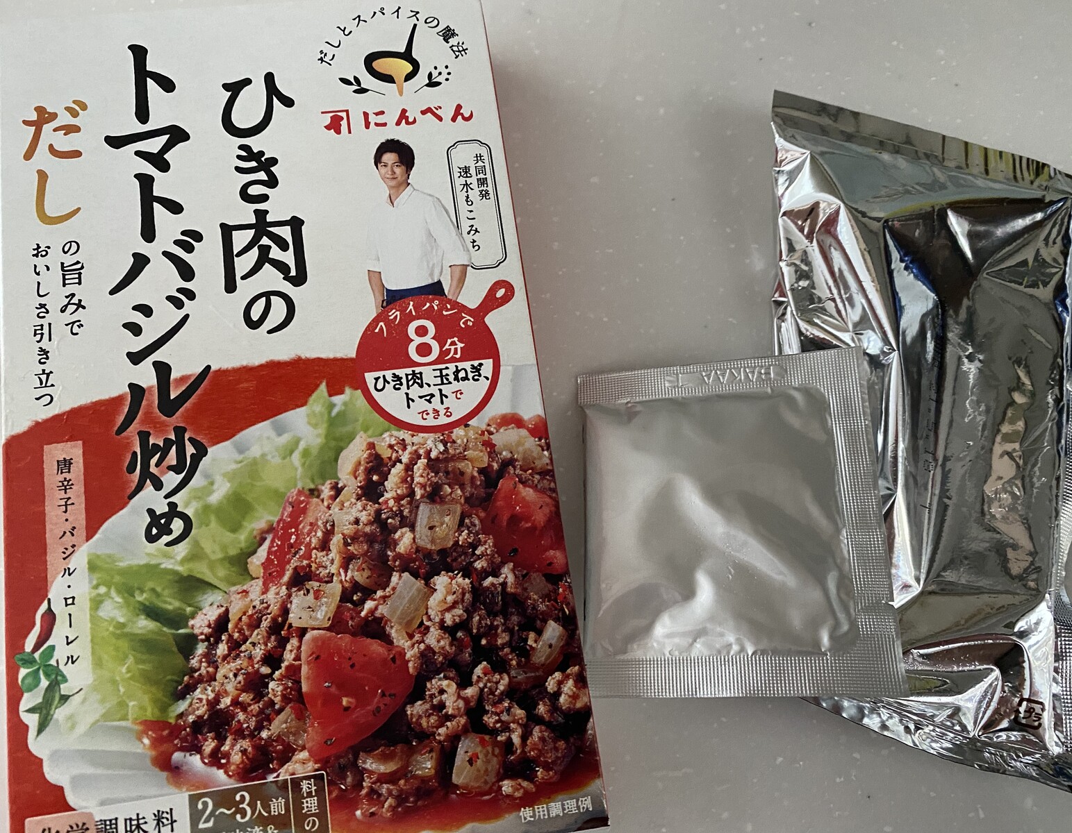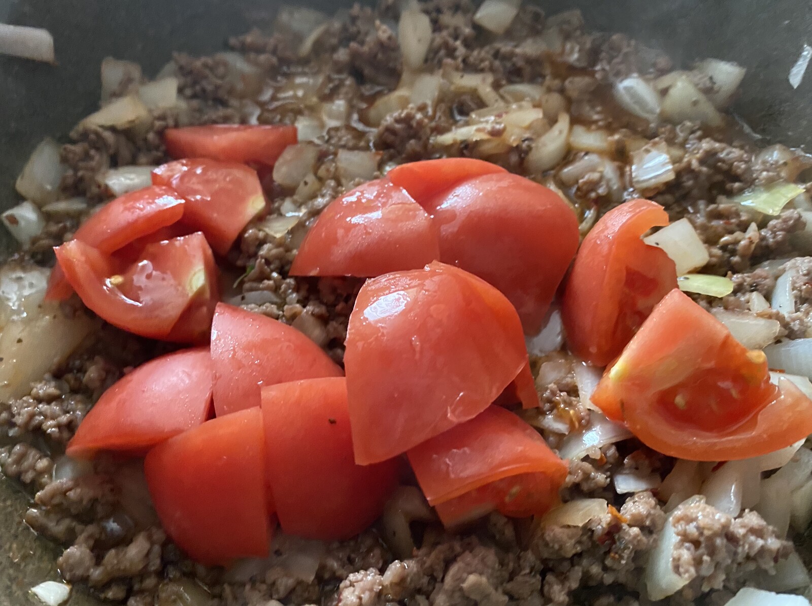 ③ 玉ねぎがしんなりしたらひき肉のトマトバジル炒めの調味液と