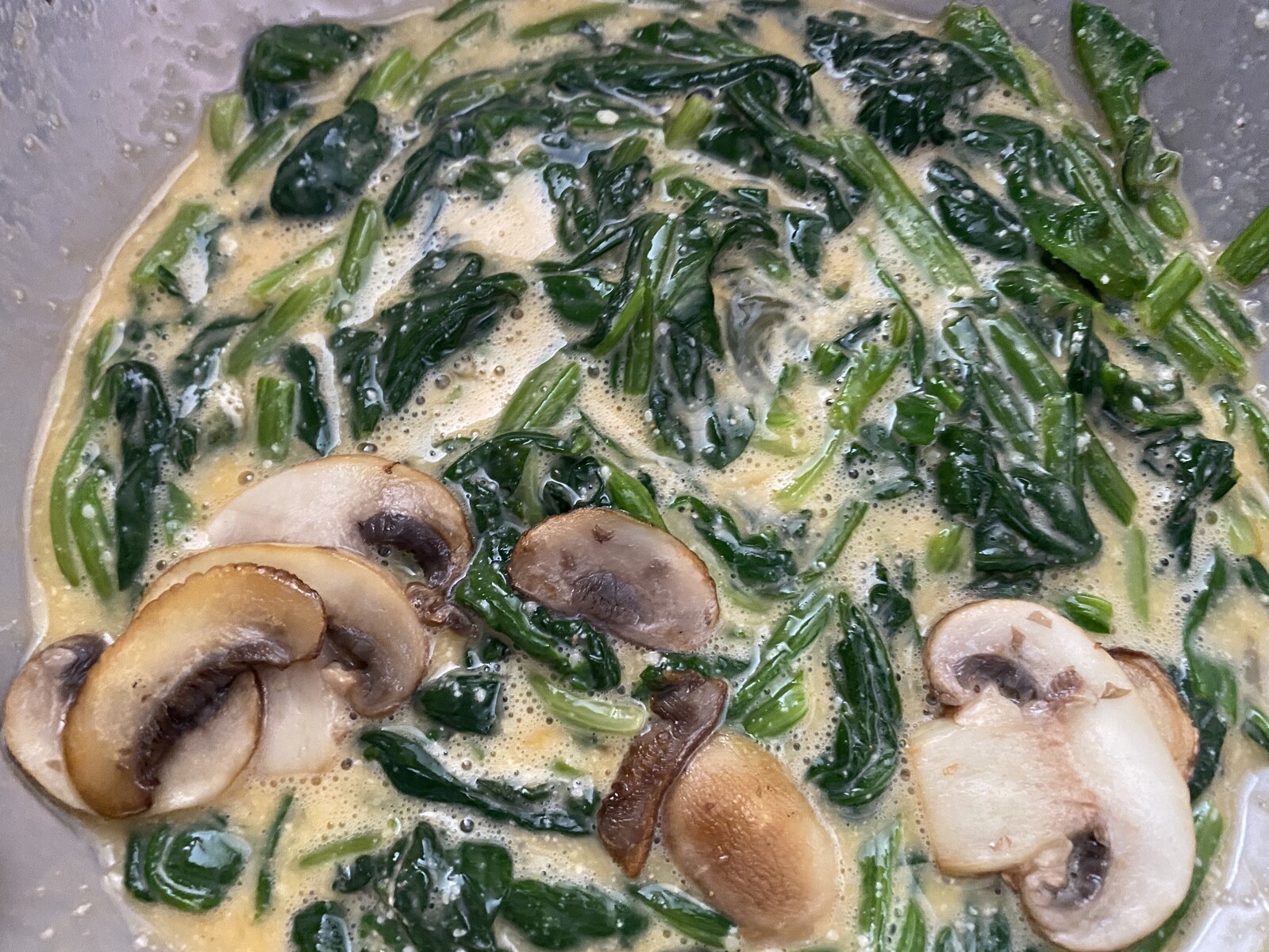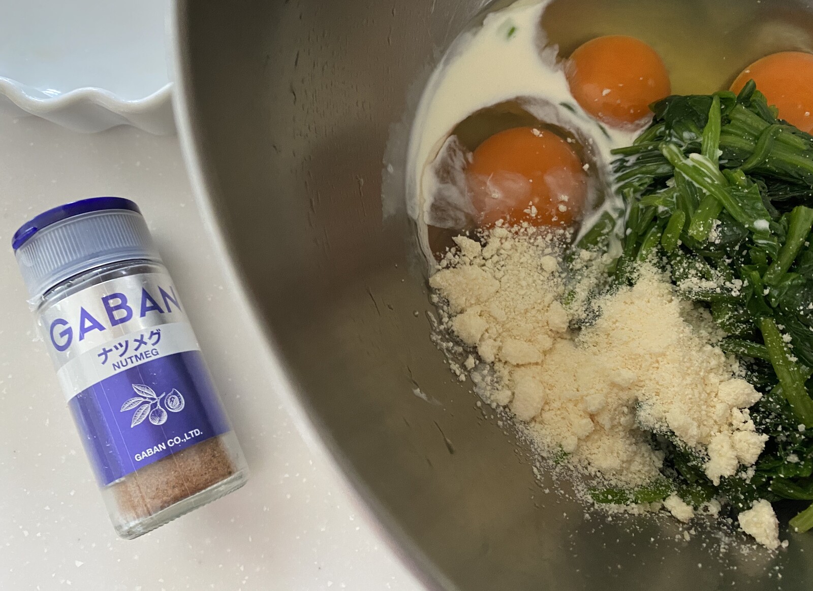 ②ボウルに 卵 ほうれん草 生クリーム・牛乳 パルミジャーノを