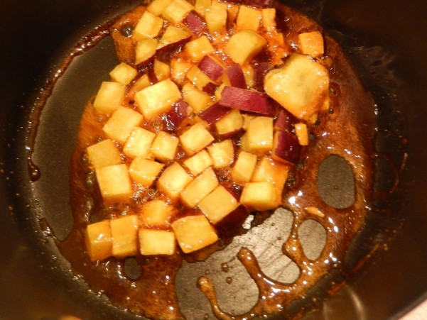 角切りのさつまいもは カラメルソースに絡めます