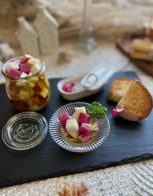 サラダカブと 紅芯大根を8mm角に切り