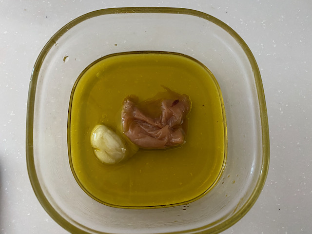 オリーブオイルに 潰したニンニクと種をとって
