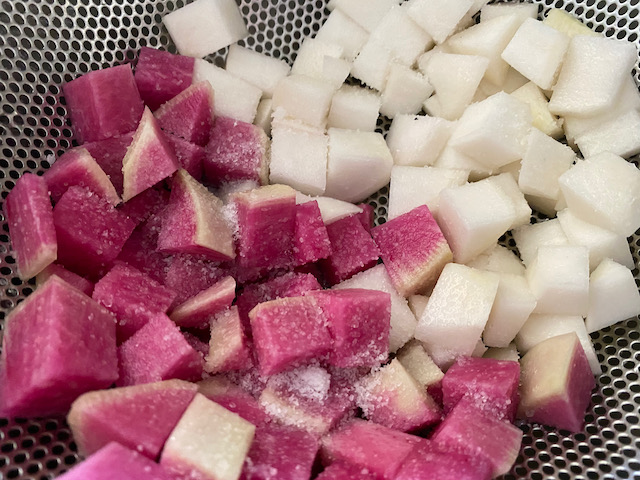 ①サラダカブと紅芯大根は 8mm角ぐらいに切り塩をふり