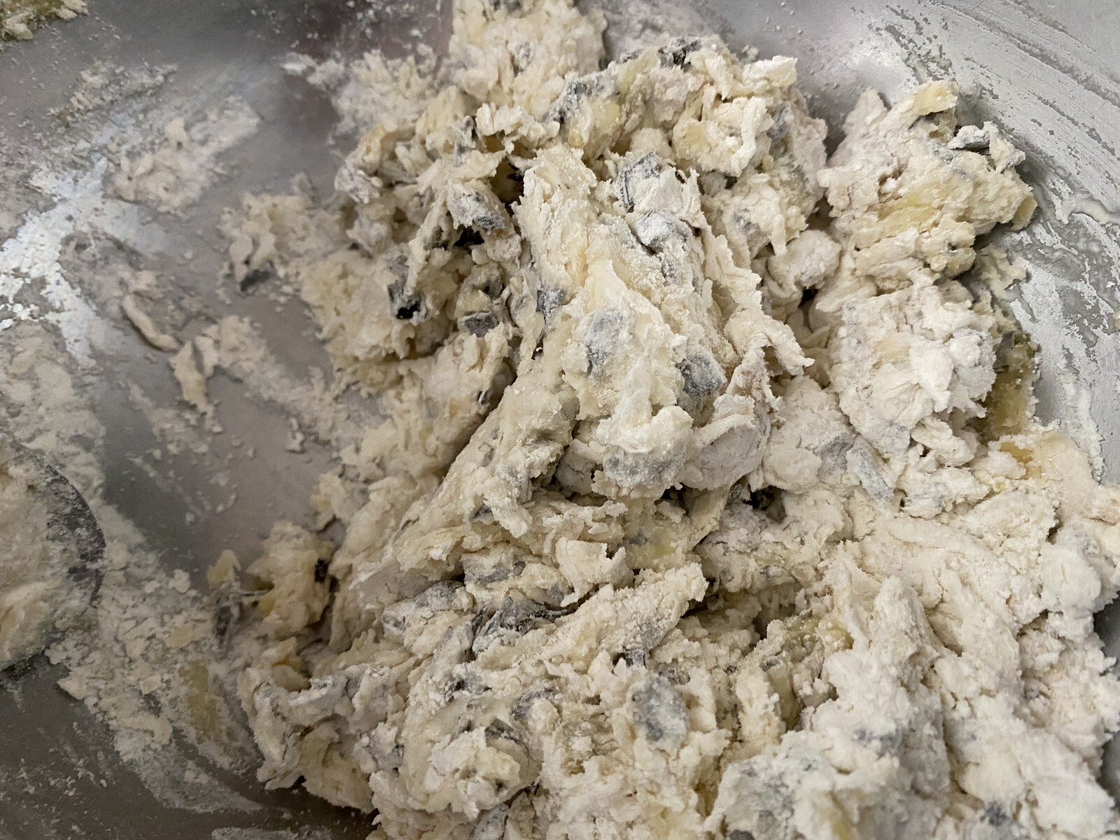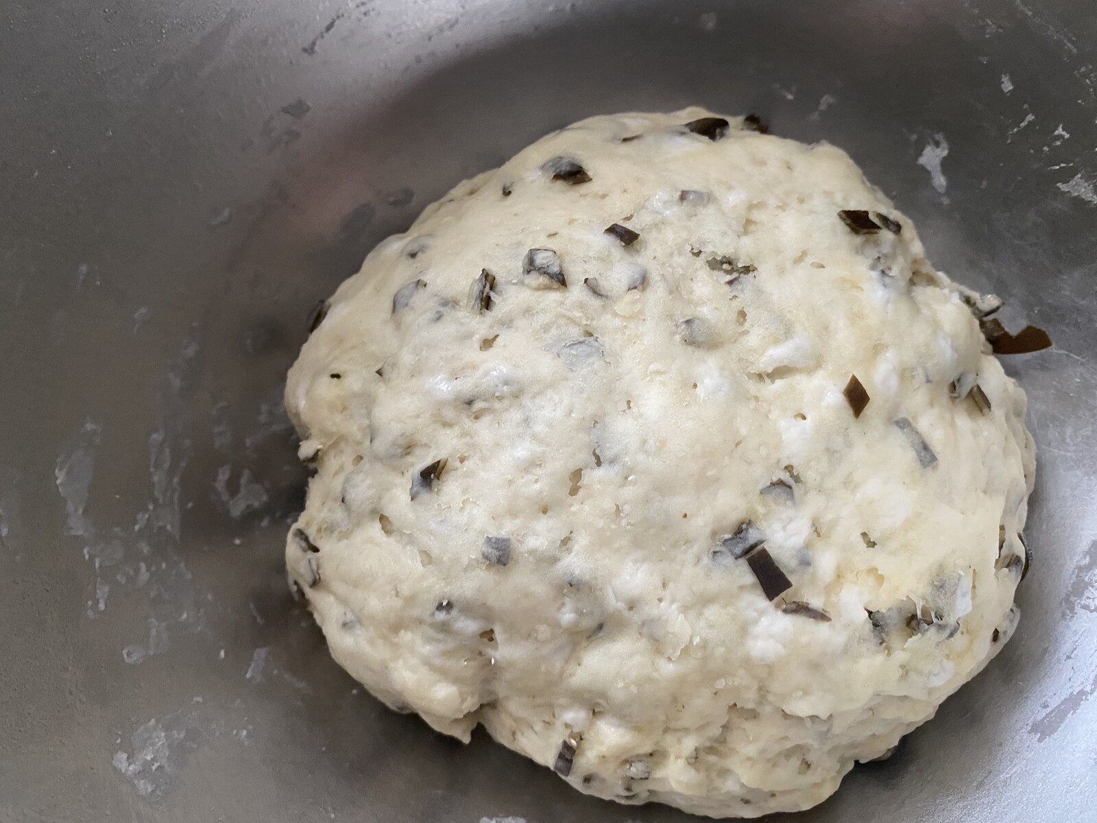 練り込み生地がべたつかなくなったら丸くしてラップをかけて
