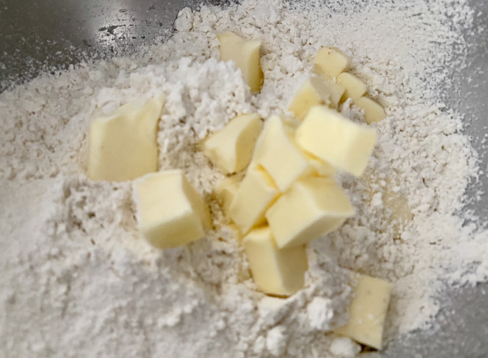 ふるった粉に 室温に戻して角切りにしたバターを加え
