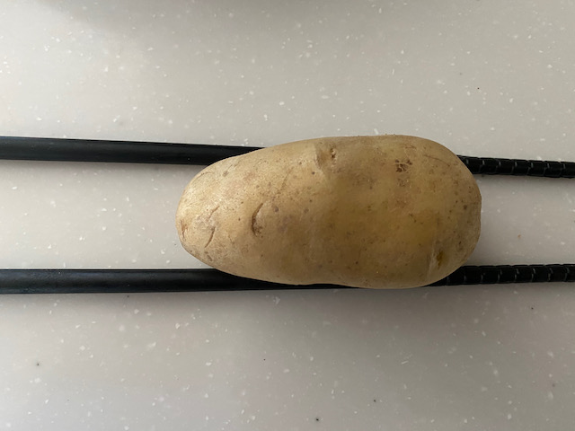 ①じゃがいもを横に置きサイドに菜箸などを置いて細かな切れ目を入れ