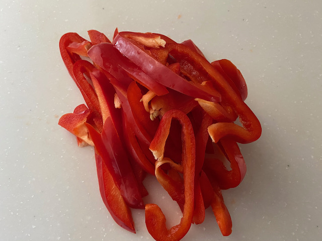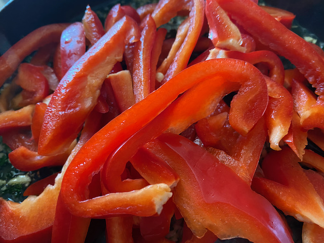 パセリを炒め香りが出たら細切りにしたパプリカを加える