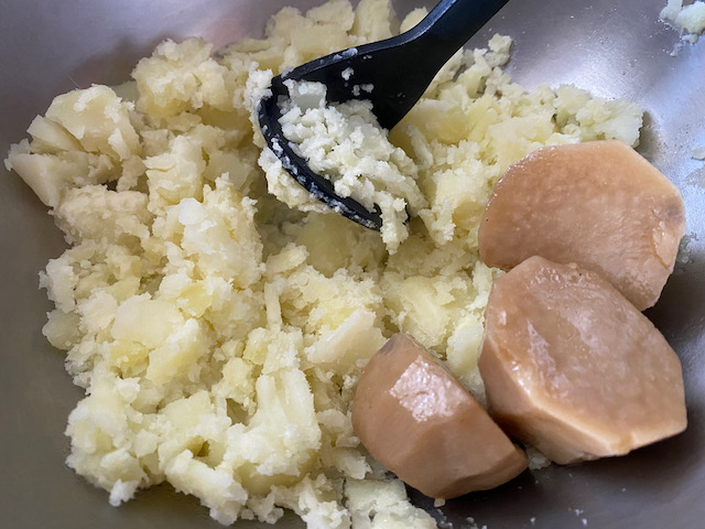 ②じゃがいもは茹でて煮物の里芋と共にマッシュして