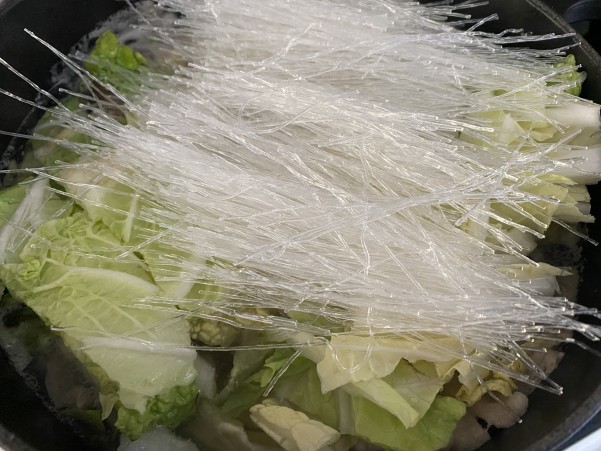 ④具材が煮えたら最後に ぬるま湯で戻した春雨を加えごま油を加え