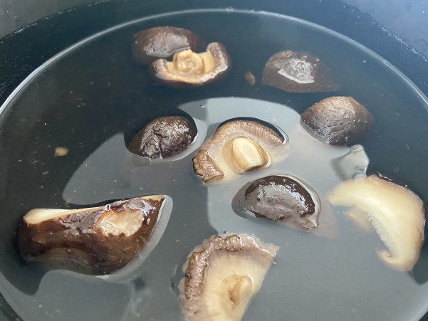 ①干しシイタケを600mlの水で戻し 戻し汁は漉しておき 干しシイタケは