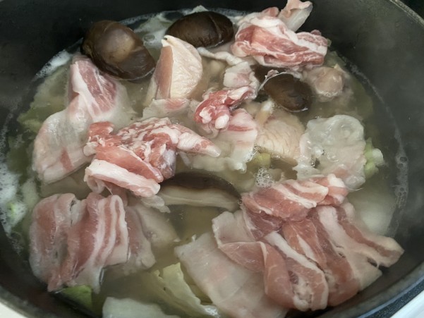 ③食べやすい大きさに切った豚バラ肉 鶏肉を加え 白菜の葉っぱの部分