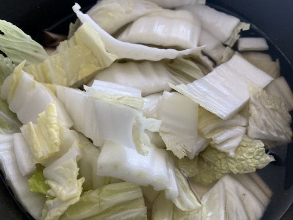 ②干しシイタケの戻し汁に 水を600ml位加え 3㎝幅ぐらいに切った白菜の
