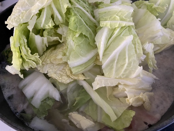 3㎝幅ぐらいに切った白菜の芯の部分を入れ弱火にかけ