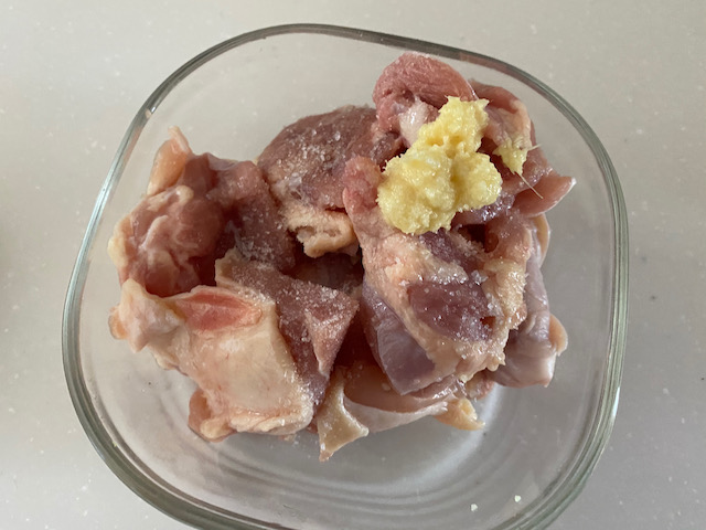 鶏肉は 日本酒 塩 おろししょうがを加えて混ぜ合わせます