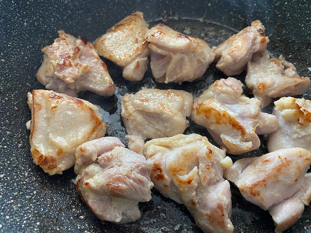 ③フライパンに米油を入れ 鶏肉の両面をこんがりと焼き