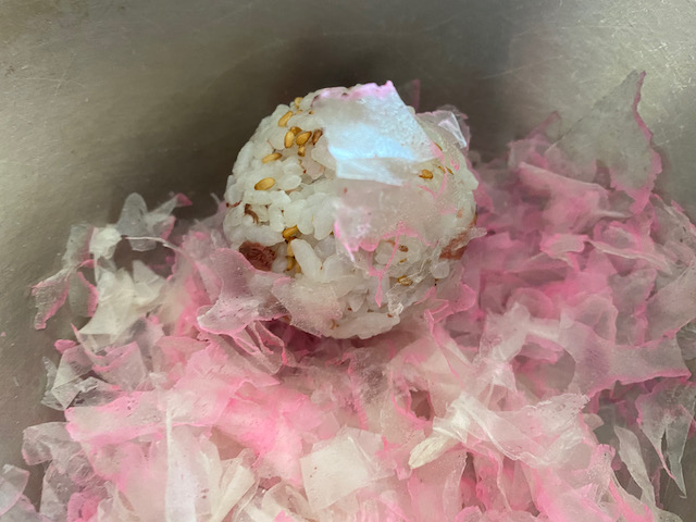 ②温かいご飯に みじん切りの桜と 白ごま だし塩をふり