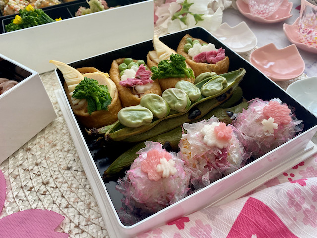 三段重に詰めて お花を飾っておうちでお花見気分です