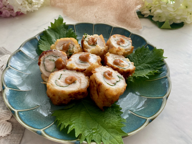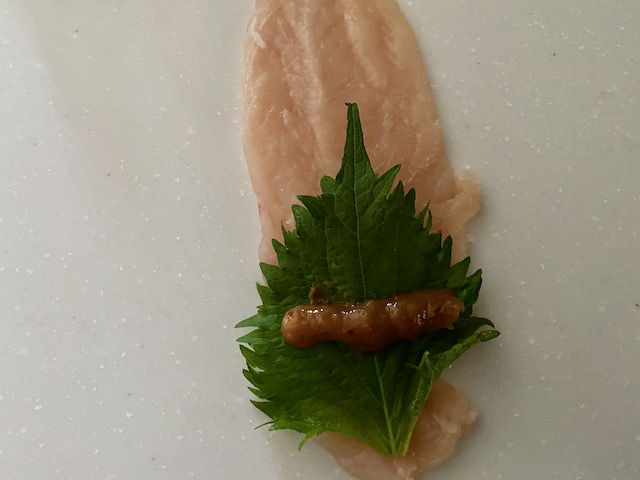 ささみを叩いてのばし しそとチューブの梅肉をのせ