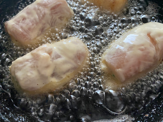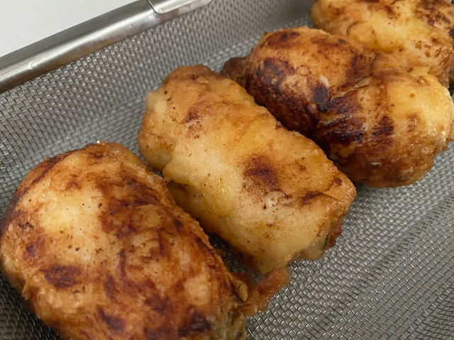 クルクル巻いてから 衣をつけて揚げ焼きしました