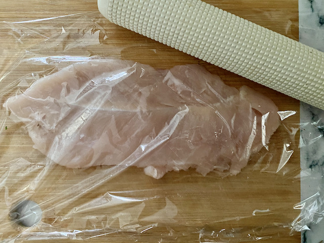 ①ささみはまな板などにのせ ラップをして麺棒などで叩いて 全体を3〜4mm厚さにする