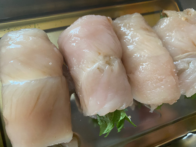 ★ささみを叩いて均等な厚さにすると巻きやすく 火の通りも均等になります