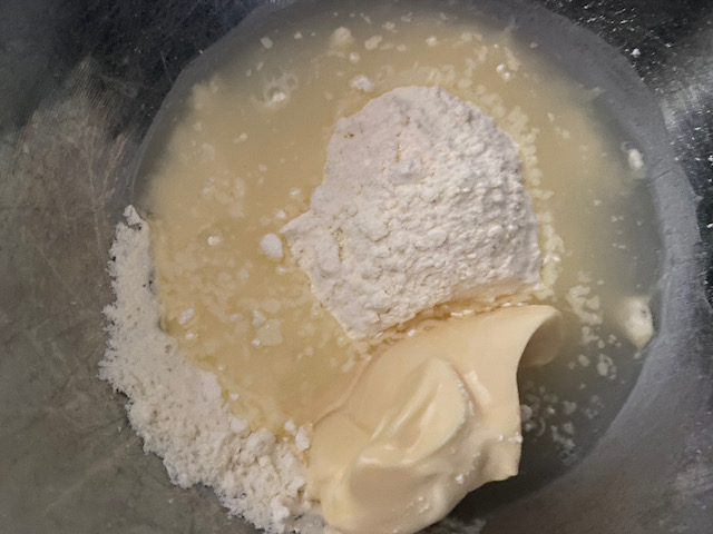 ③薄力粉 水 マヨネーズを混ぜ合わせ衣を作り タレに漬け込んだささみに絡ませ