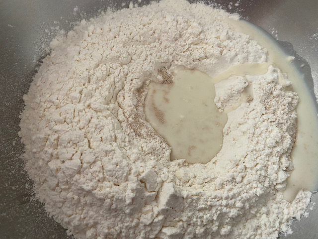 ①強力粉をボウルに入れ真ん中をくぼませ イースト 砂糖を加え