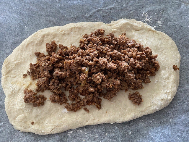 クッキングペーパーの上にのせ細長く伸ばし 炒めた牛ひき肉をのせ