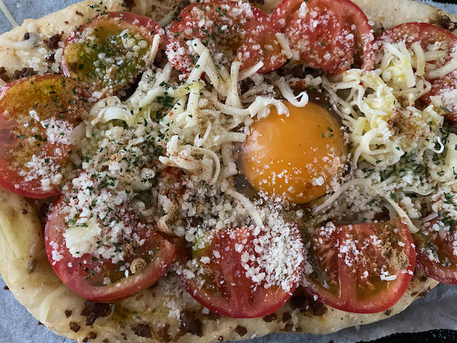 一旦取り出し 真ん中に卵 周りにチーズと薄切りのトマトをのせ