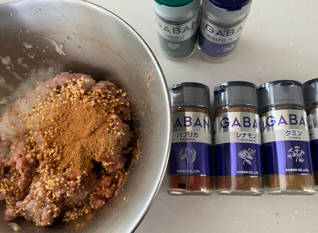 ③牛ひき肉にすりおろした玉ねぎ ◎のGABAN(あらびきガーリック・パプリカ・シナモン・