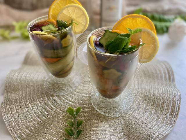 そのリキュールにオレンジやレモン ミントに きゅうりを入れて炭酸水で割った