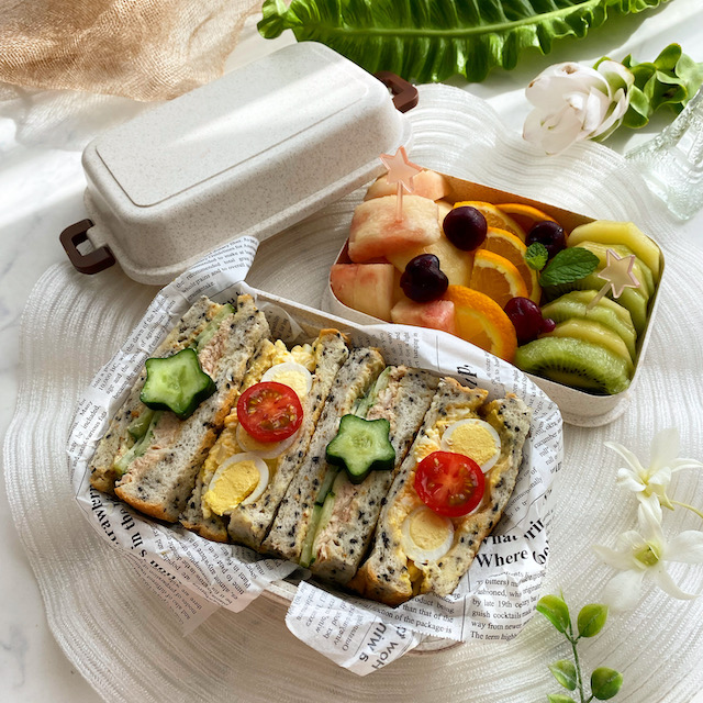 もち粉ごまパンのサンドイッチとフルーツ盛り合わせです