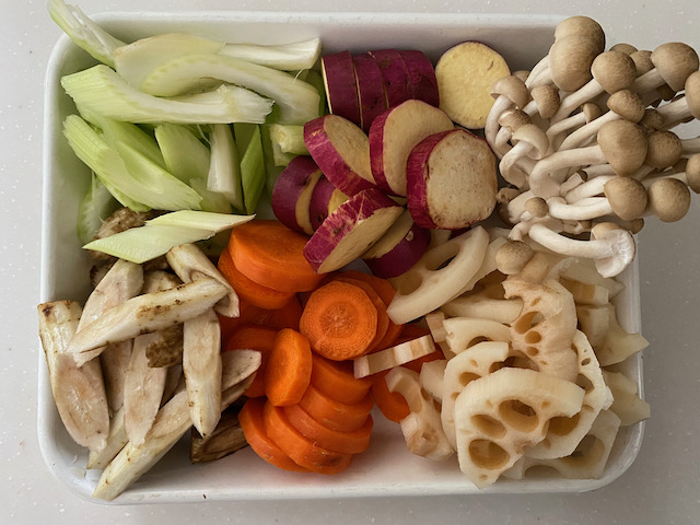①セロリは斜め切り ごぼうは皮を取り斜めに さつまいもと人参は輪切り