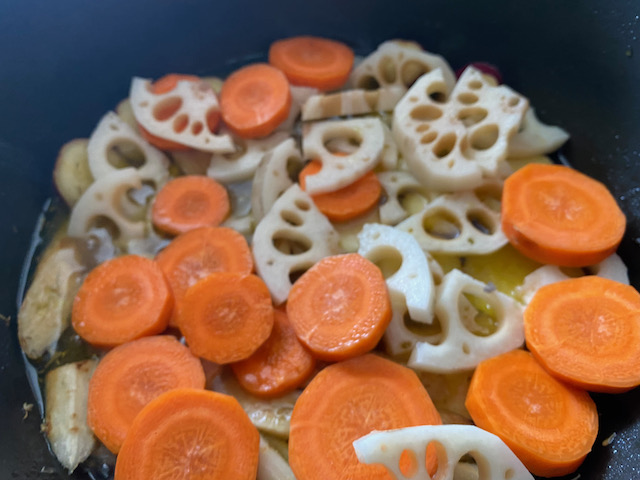 硬い野菜 さつまいも 牛蒡から入れて蓋をして5分