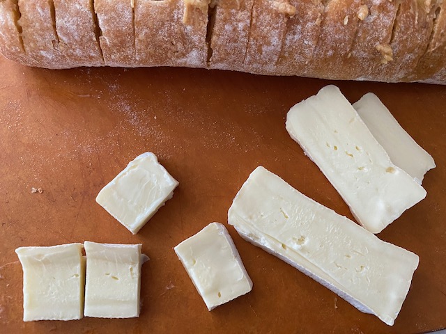 ③切り込みを入れたバケットにたっぷりとぬり チーズと砕いたくるみを挟み
