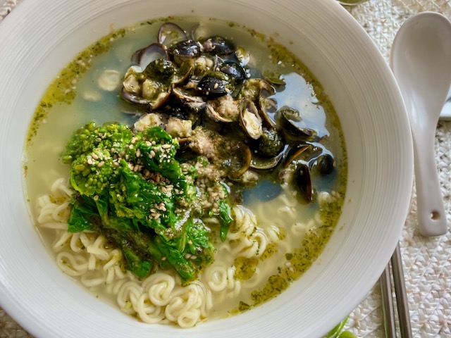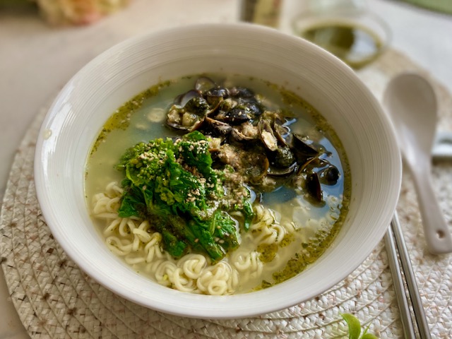 しじみを加えて 仕上げにバジルオイルソースをたらします