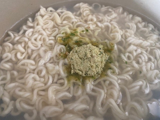②麺がほぐれたところで粉末スープを入れかき混ぜる
