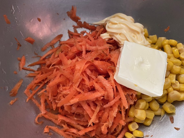 野菜おろし器で 薄くスライスした人参にコーンも加え