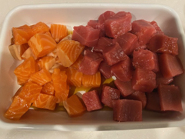マグロとサーモンは1cmぐらいの角切りにして醤油・日本酒をまぶしておく