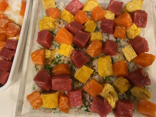 魚と同じぐらいの角切りにした 卵焼き マグロ サーモンをのせる