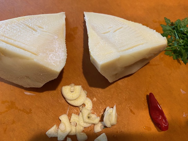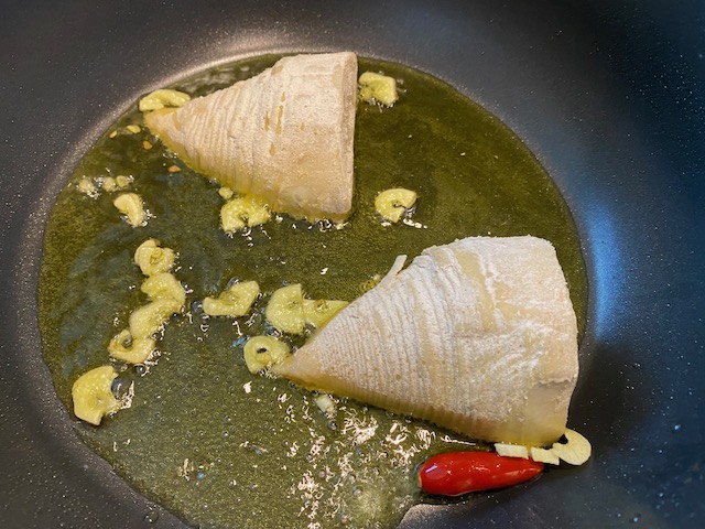 今日は 半分に切って にんにくで香りをつけたオイルで