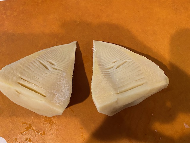 下茹でした筍は 縦半分に切ります