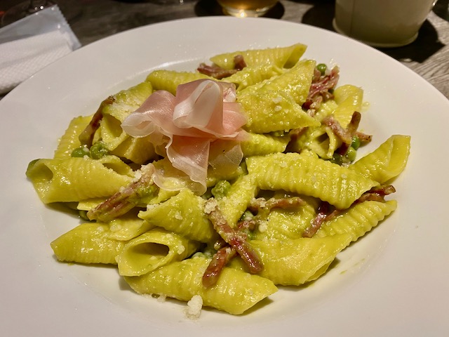 えんどう豆のペーストと生ハムの手打ちパスタ