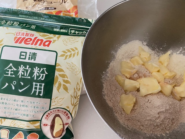 ①ふるった薄力粉と日清全粒粉に角切りにしたバターと塩を加え