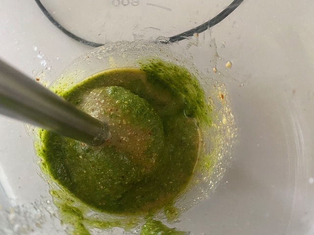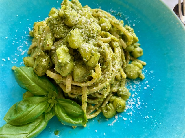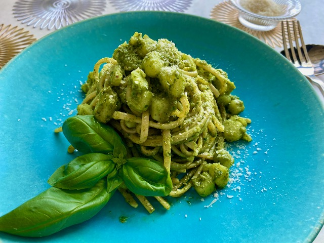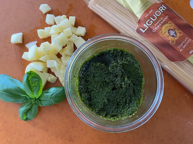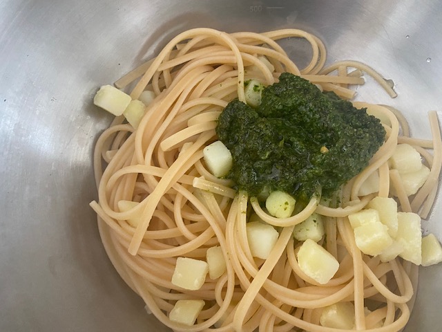 水気を切り熱いうちにバジリコソースを加え全体をよく和える