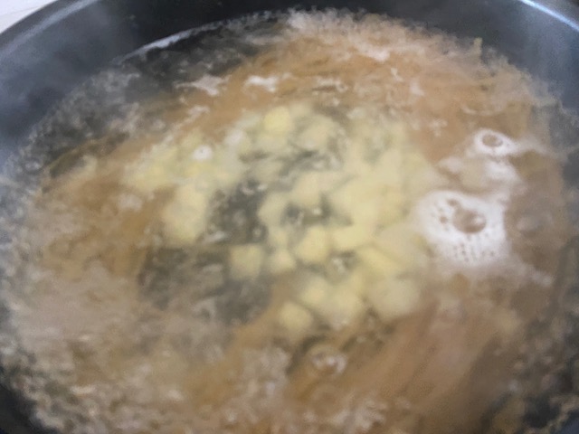 初めからパスタと一緒に茹でソースにとろみをつけます