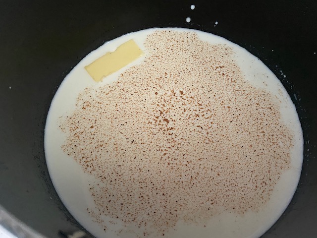 鍋に牛乳 バター ナツメグ 塩を入れ火にかけ