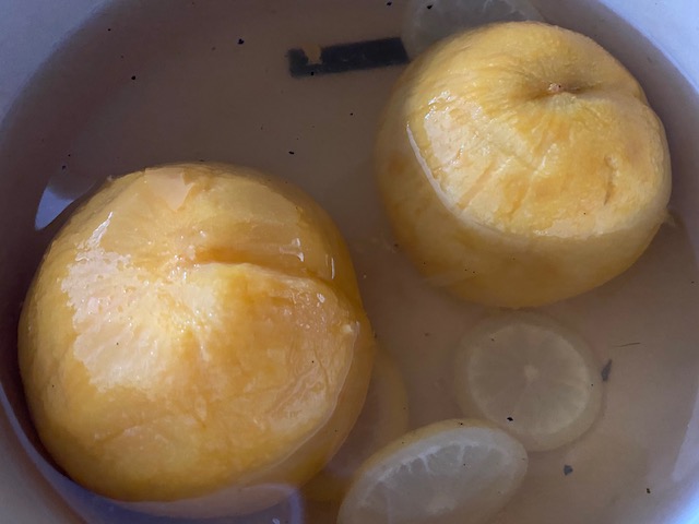 皮を剥いた福島県産黄貴妃とレモンスライスを加え