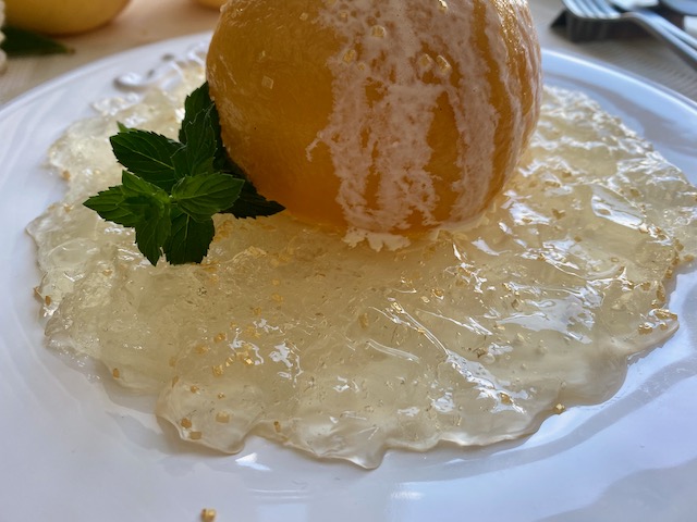 ④お皿に崩したゼリーを盛り付け 桃のコンポートをのせ