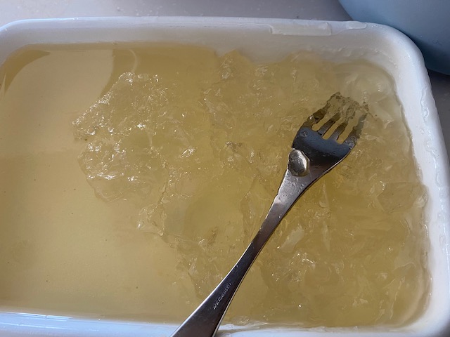 200mlの煮汁と混ぜ合わせタッパーに入れ冷蔵庫で固め